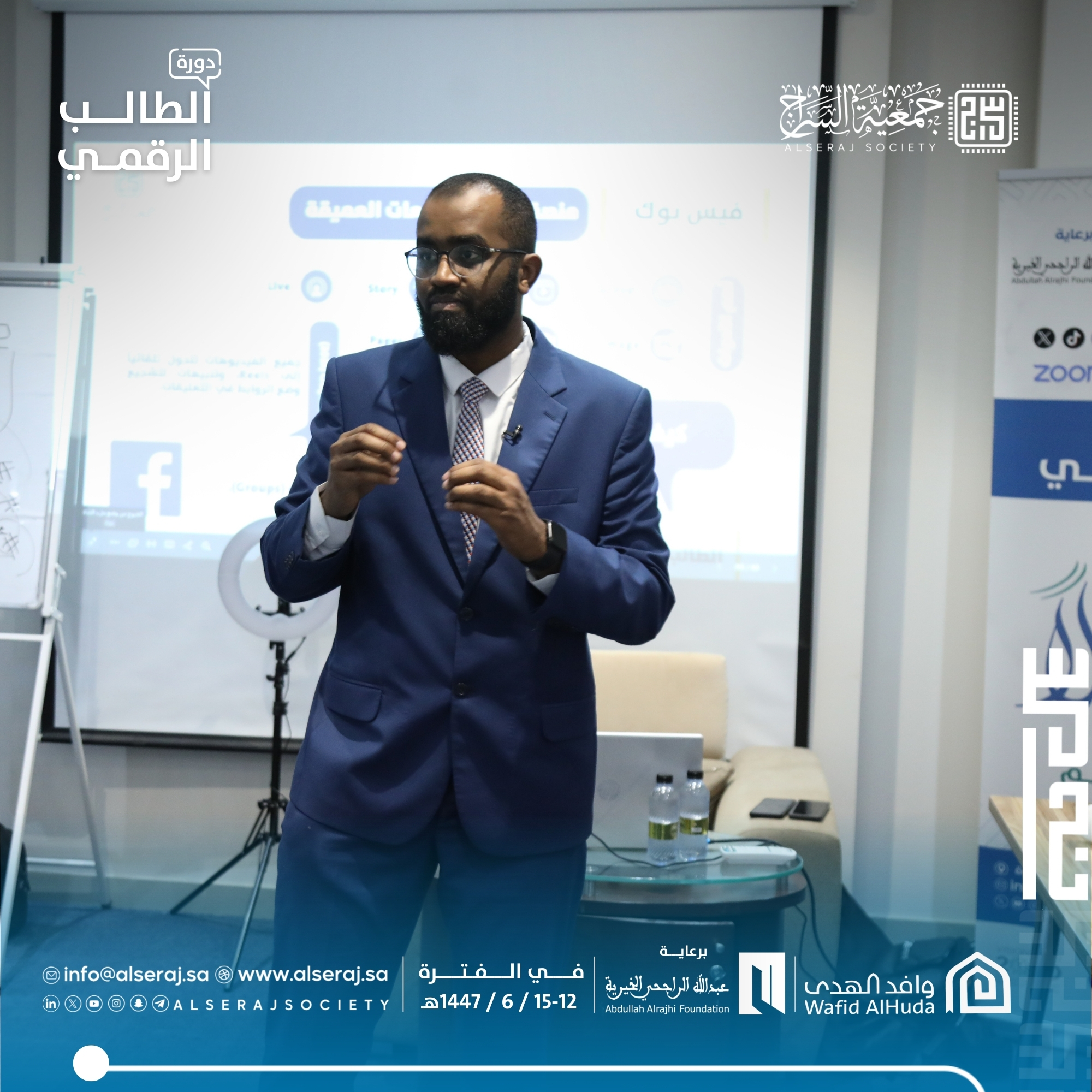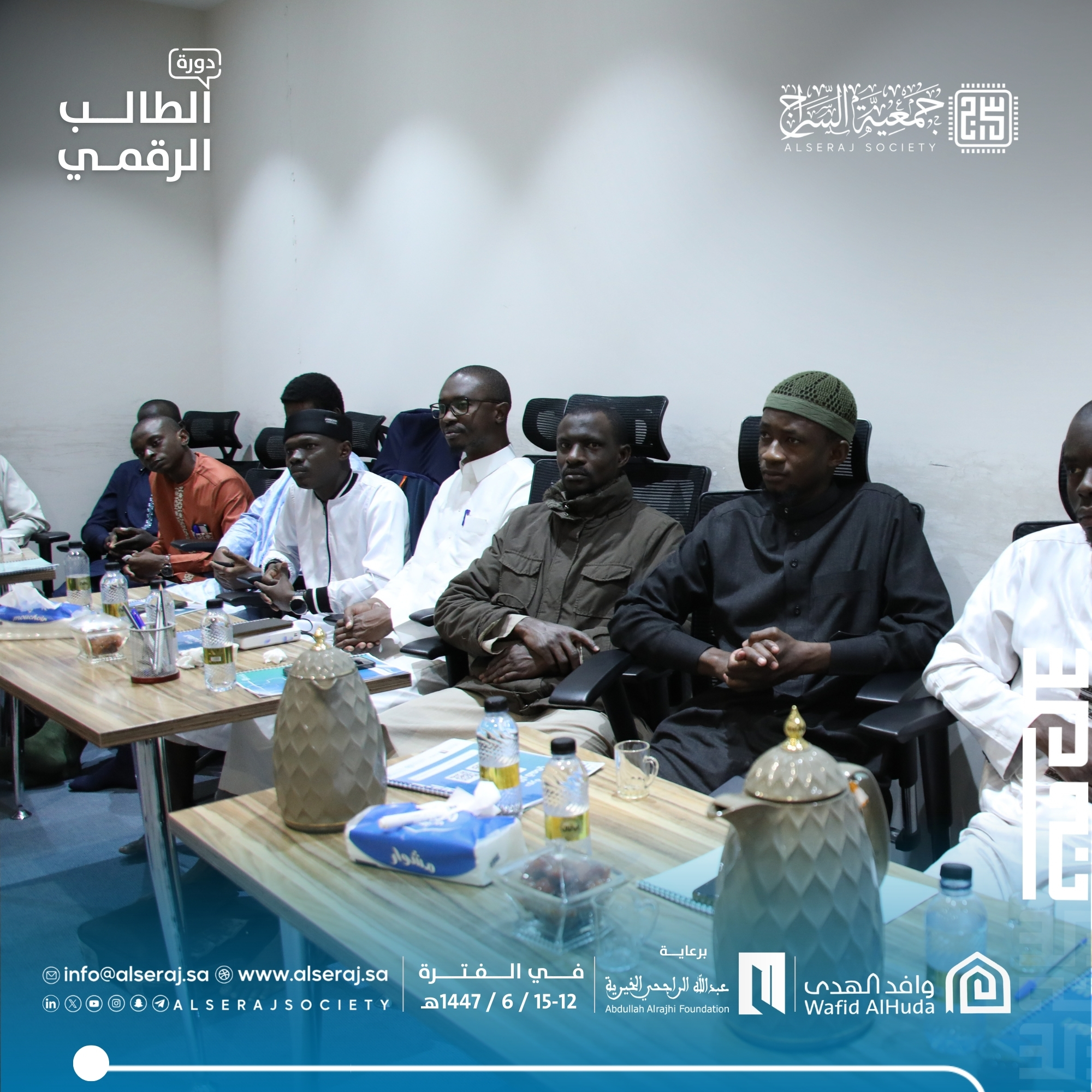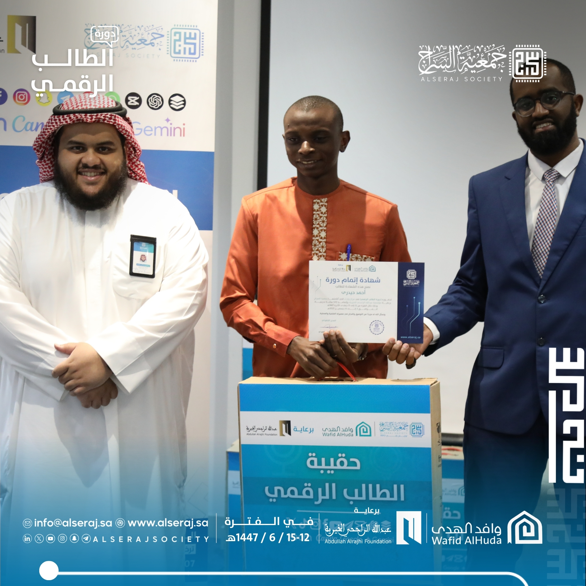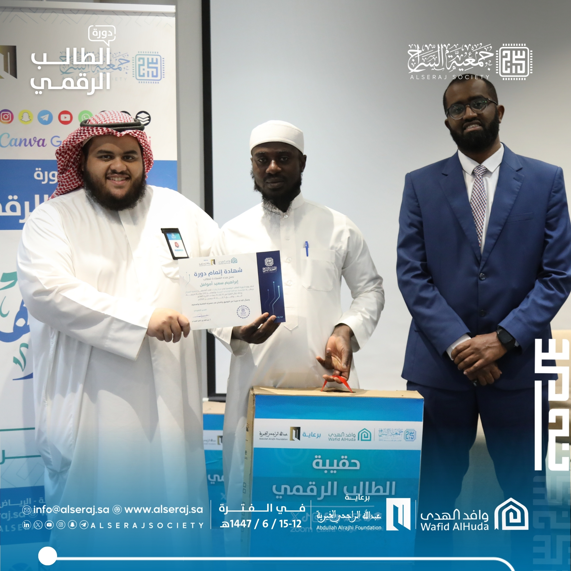 اختتمت جمعية السراج اليوم السبت 6 ديسمبر 2025م الموافق 15 جمادى الاخرة 1447هـ دورة الطالب الرقمي السادسة في سلسلة دورات الطالب الرقمي التي تقيمها الجمعية برعاية كريمة من مؤسسة عبدالله الراجحي الخيرية بمركز وارث وبالتعاون مع وافد الهدى.