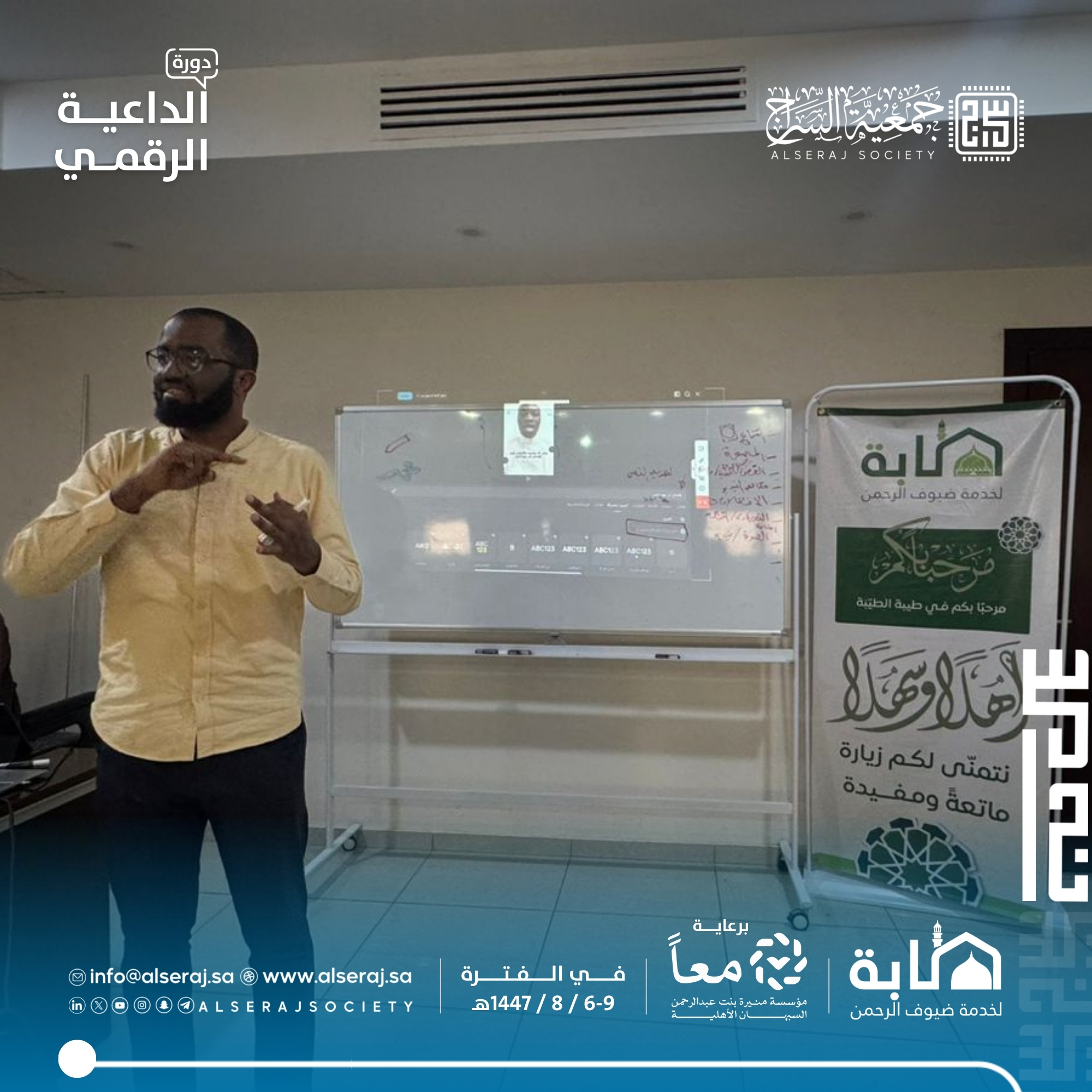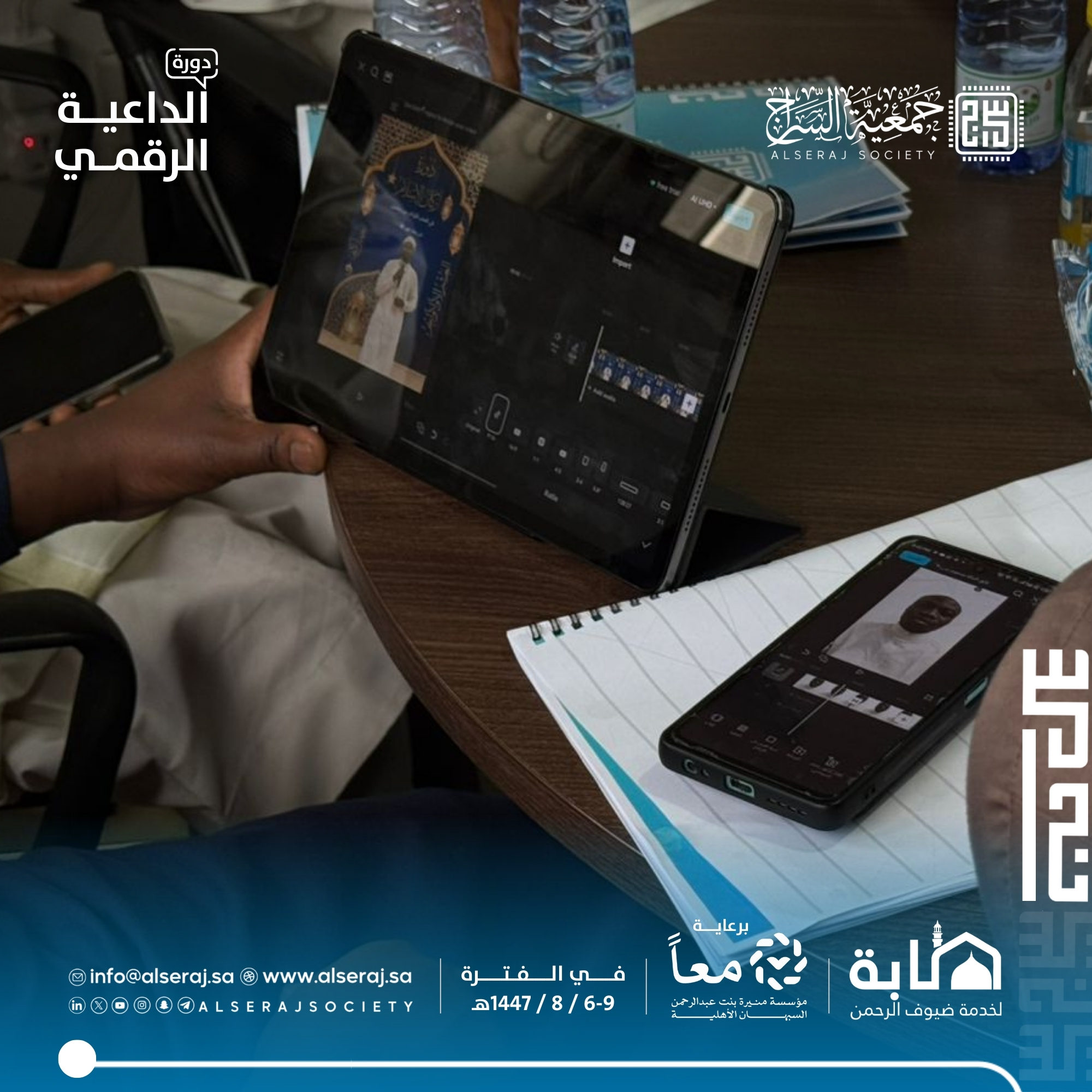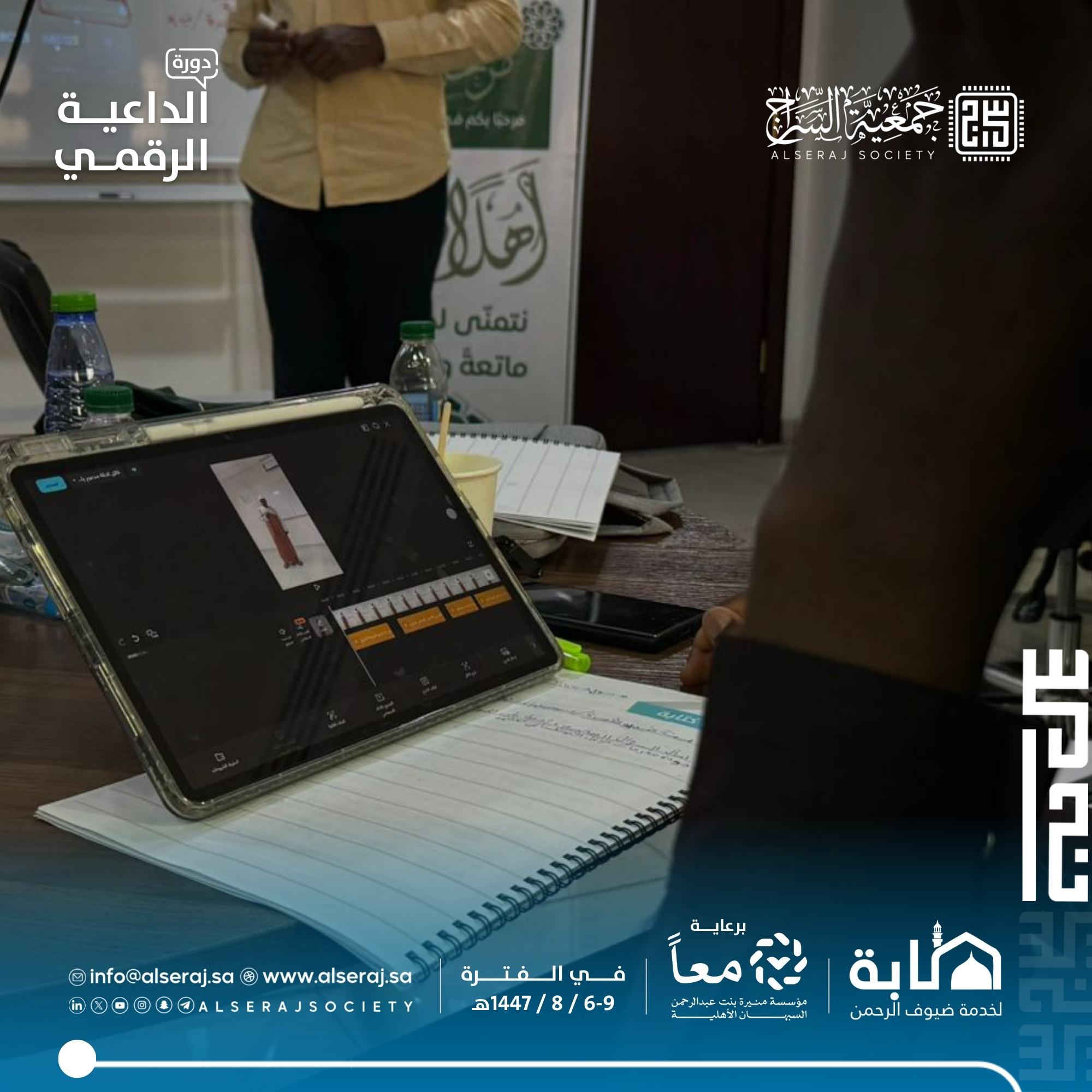 أقامت جمعية السراج يوم الثلاثاء 8 شعبان 1447هـ الموافق 27 يناير 2026م دورة الداعية الرقمي في يومها الثالث والتي تستمر اربعة أيام برعاية مؤسسة منيرة بنت عبدالرحمن السبهان الأهلية وبالتعاون مع جمعية طابة لخدمة ضيوف الرحمن، حيث تناول البرنامج الجانب العملي والإنتاجي للمحتوى، مع تركيز على التصوير والمونتاج.