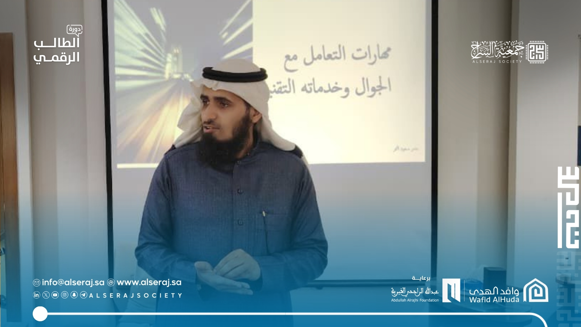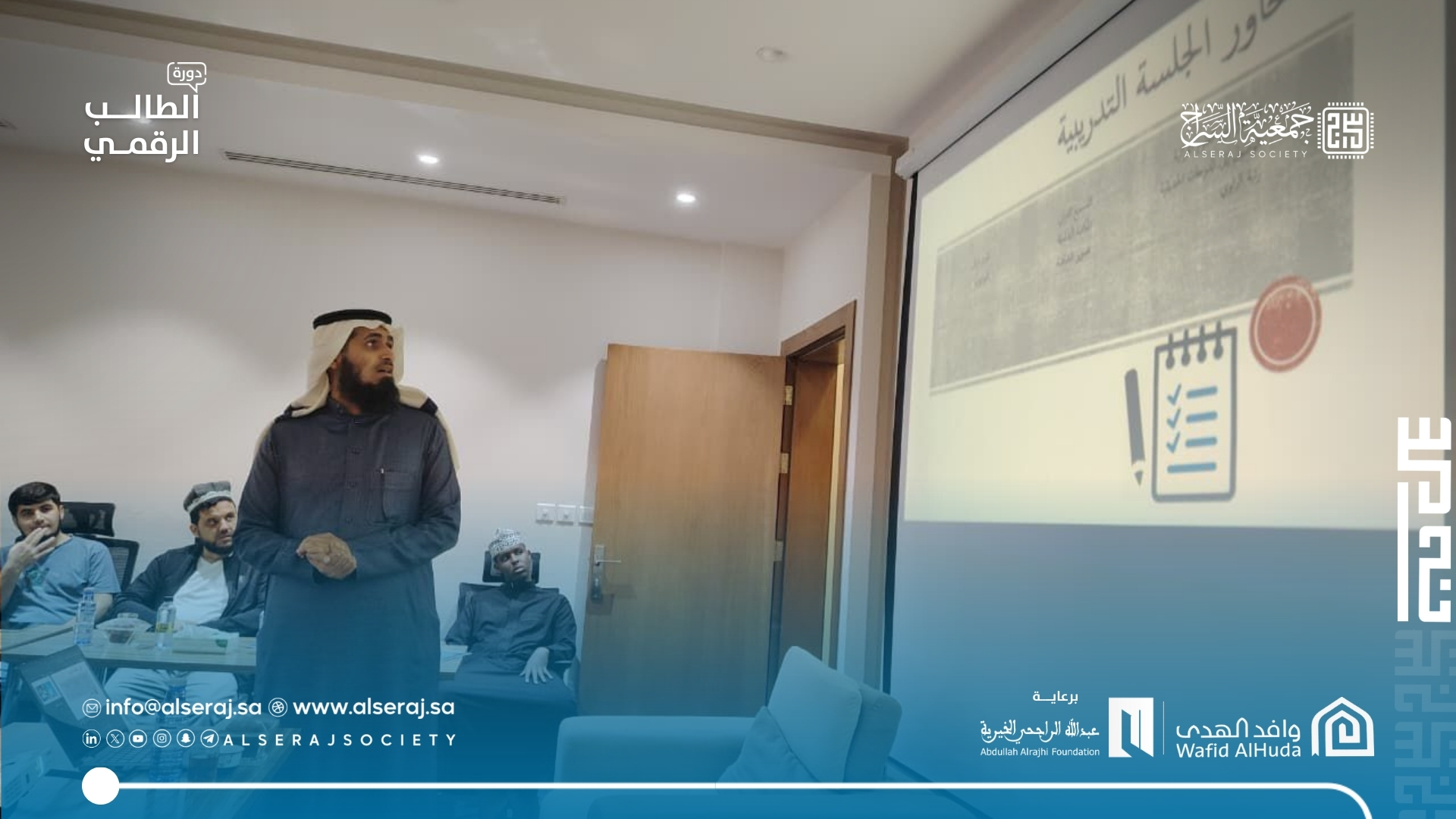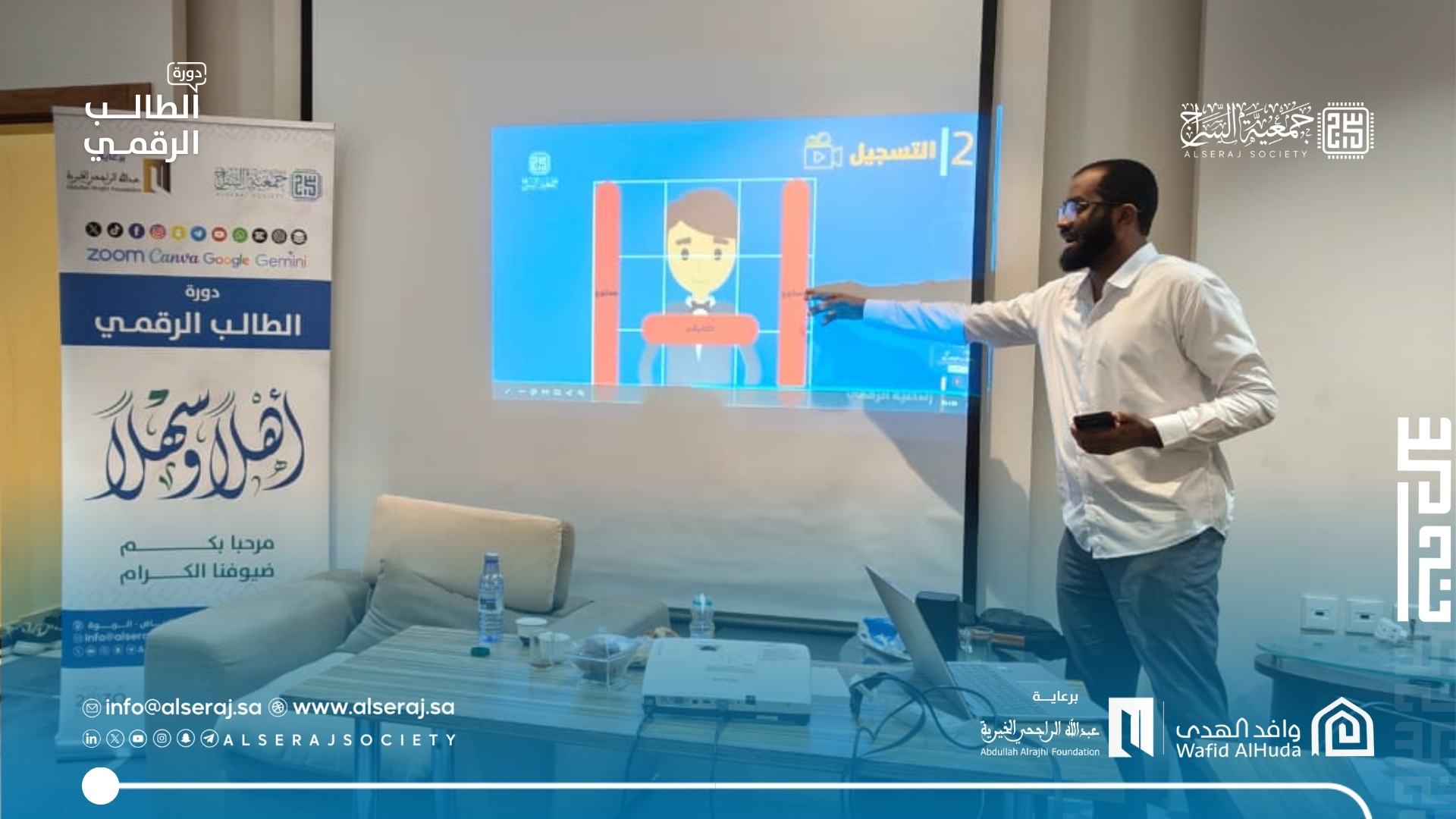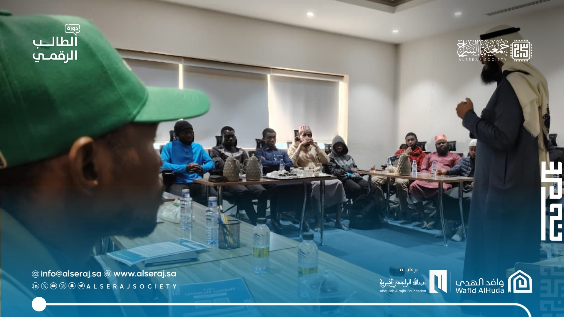 أقامت جمعية السراج دورة الطالب الرقمي التاسعة في سلسلة دورات الطالب الرقمي برعاية مؤسسة عبدالله الراجحي الخيرية بمركز وارث وبالتعاون مع وافد الهدى في يومها الثالث والتي تستمر اربعة أيام , حيث تناول البرنامج الجانب العملي والإنتاجي للمحتوى، مع تركيز على التصوير والمونتاج.