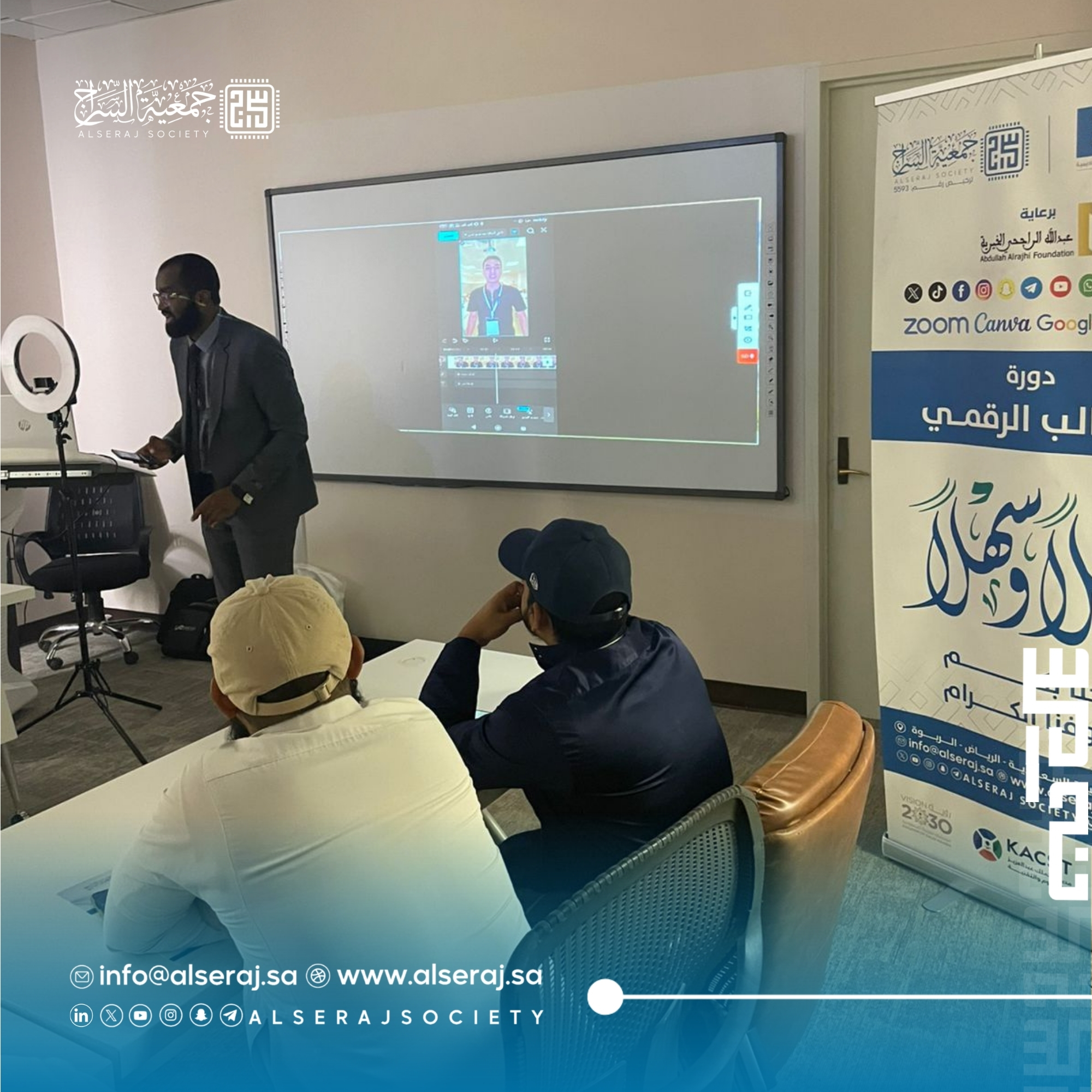 أقامت جمعية السراج اليوم 14 اكتوبر 2025م دورة الطالب الرقمي الثانية في سلسلة دورات الطالب الرقمي في يومها الثالث بالتعاون مع جامعة الملك سعود وكالة الشؤون التعليمية والأكاديمية – إدارة الطلبة الدوليين وبرعاية مؤسسة عبدالله الراجحي الخيرية, حيث تناول البرنامج الجانب العملي والإنتاجي للمحتوى، مع تركيز على التصوير والمونتاج.