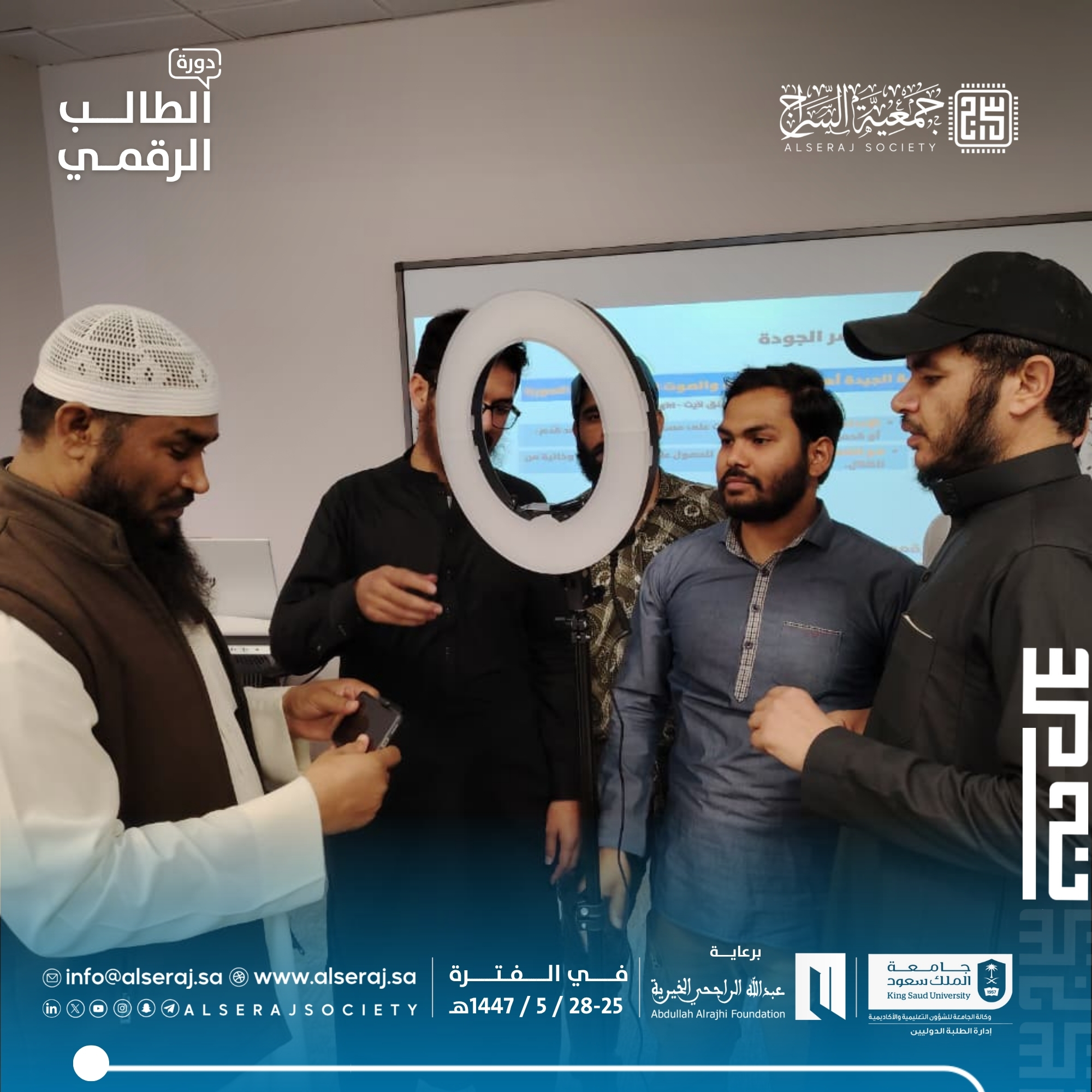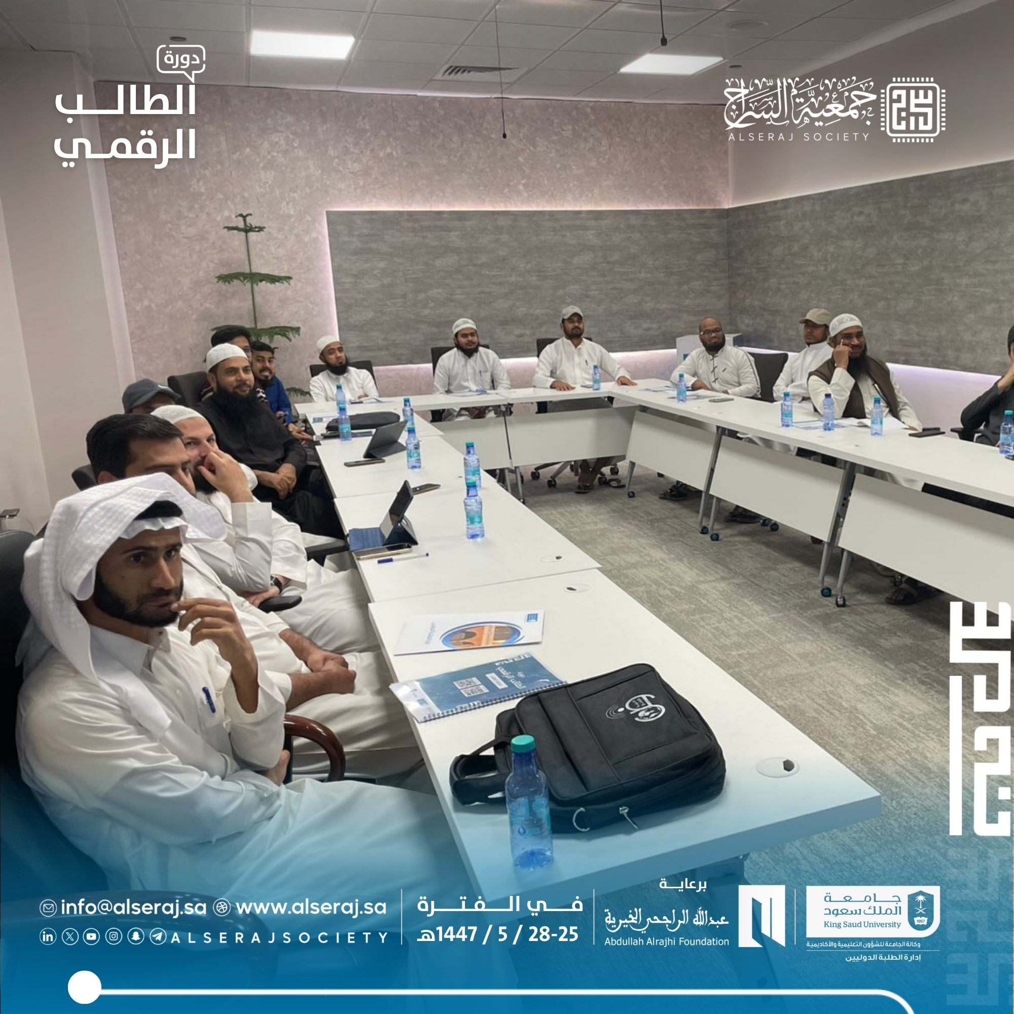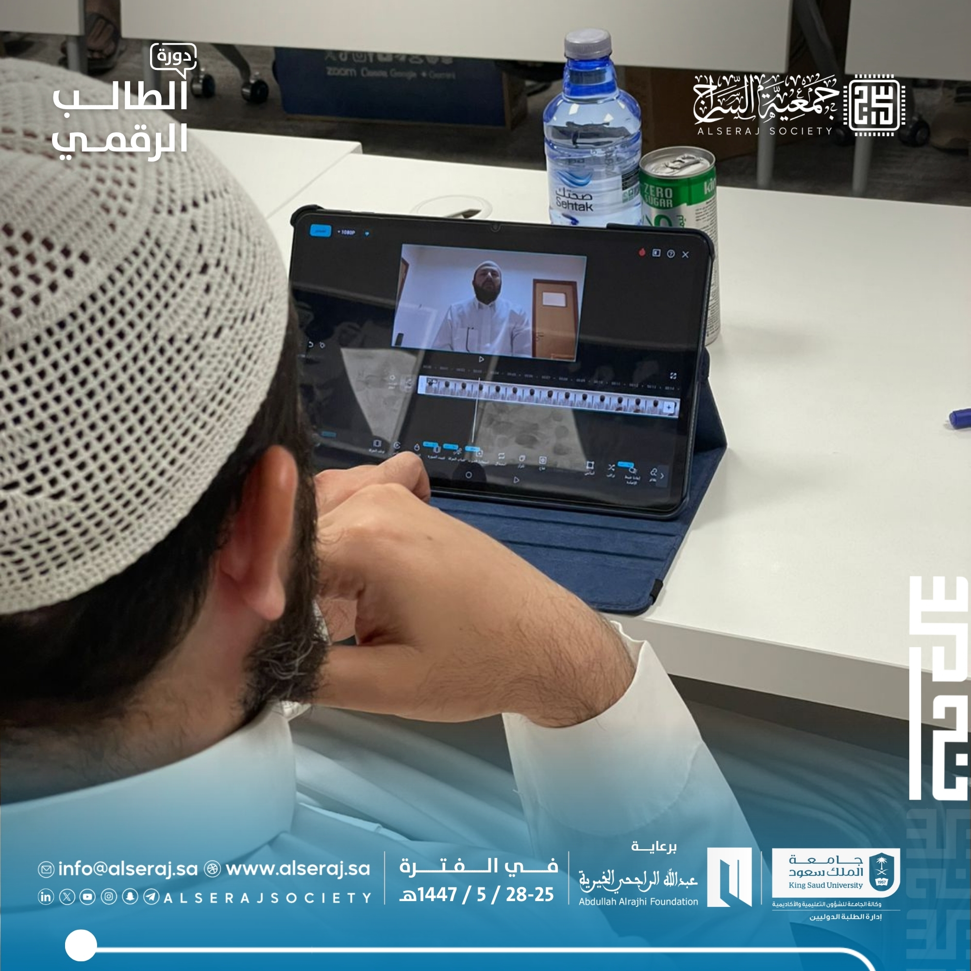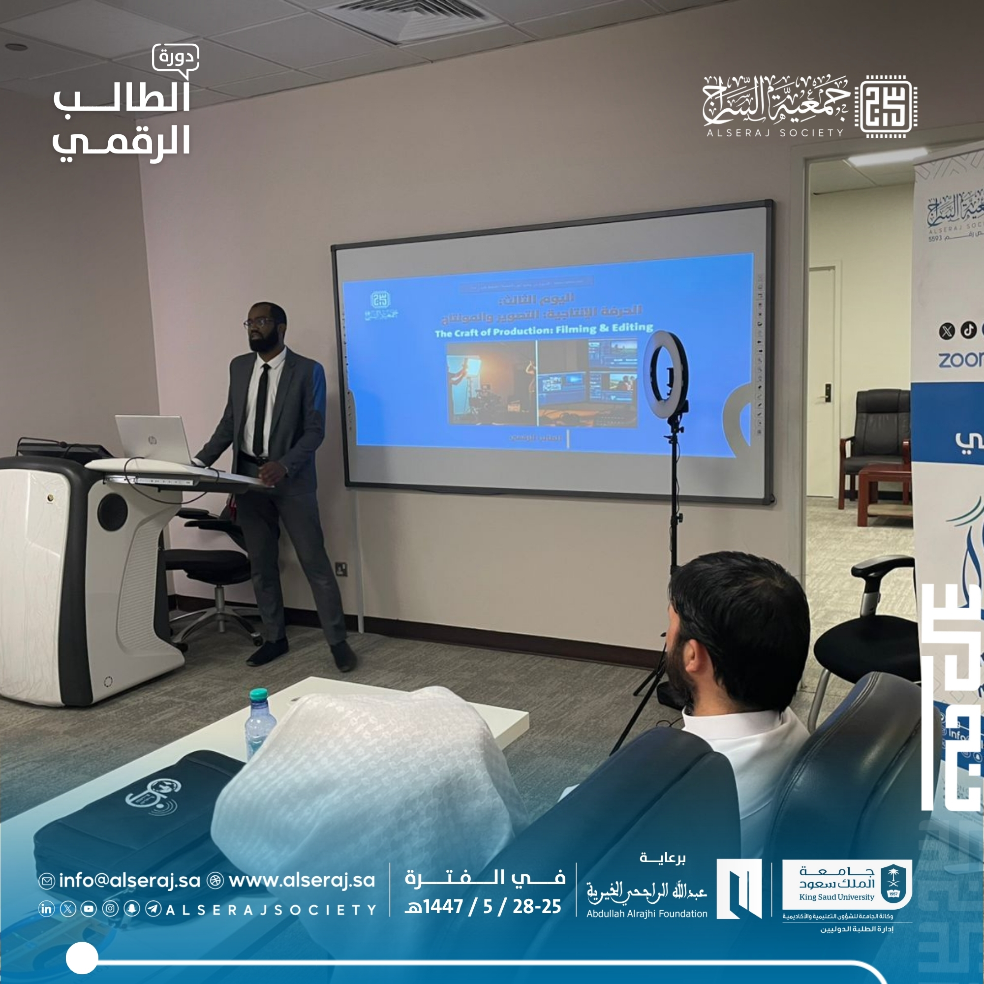 أقامت جمعية السراج اليوم الثلاثاء 18 نوفمبر 2025م دورة الطالب الرقمي الحامسة في سلسلة دورات الطالب الرقمي في يومها الثالث والتي تستمر اربعة أيام برعاية مؤسسة عبدالله الراجحي الخيرية وبالتعاون مع جامعة الملك سعود – إدارة الطلبة الدوليين, حيث تناول البرنامج الجانب العملي والإنتاجي للمحتوى، مع تركيز على التصوير والمونتاج.