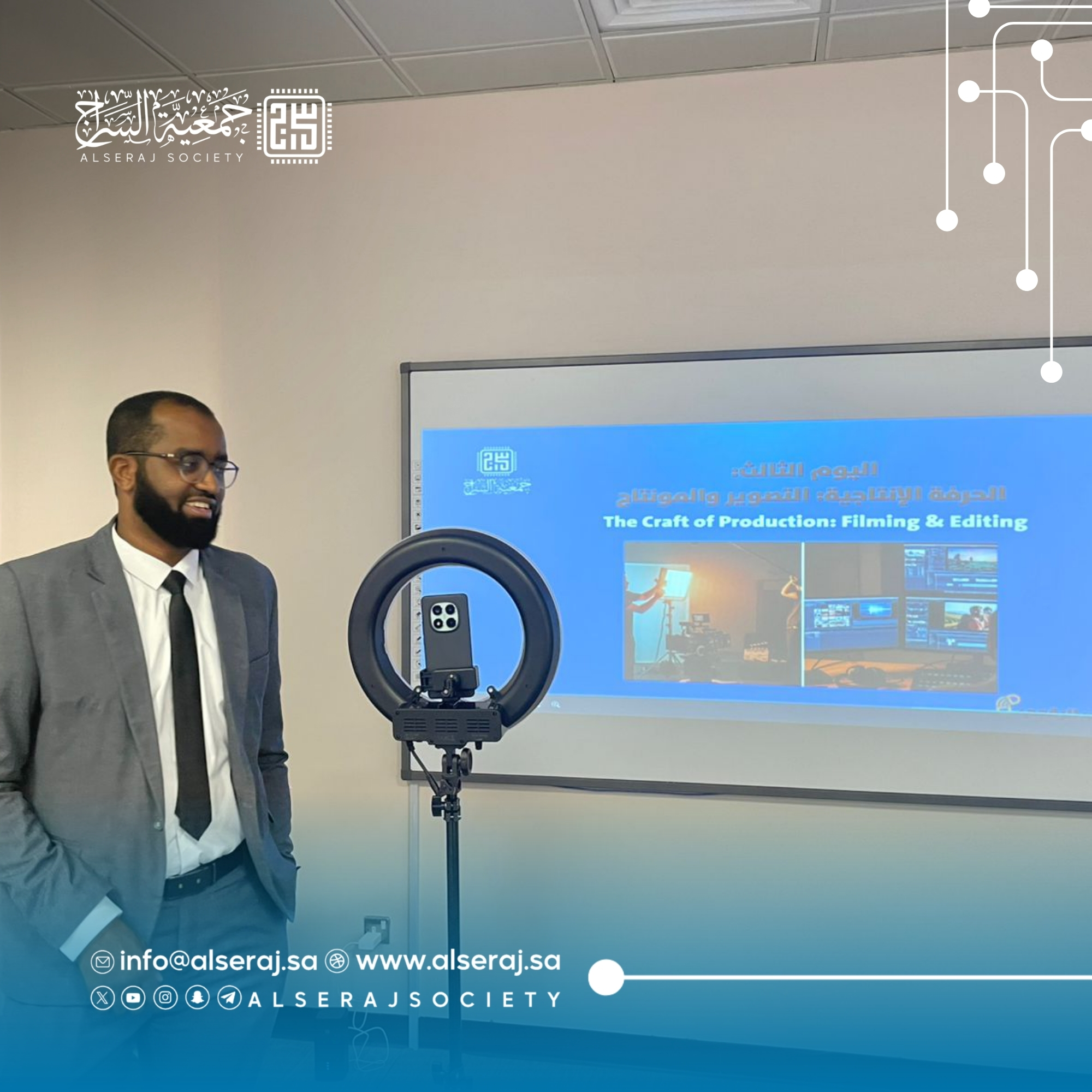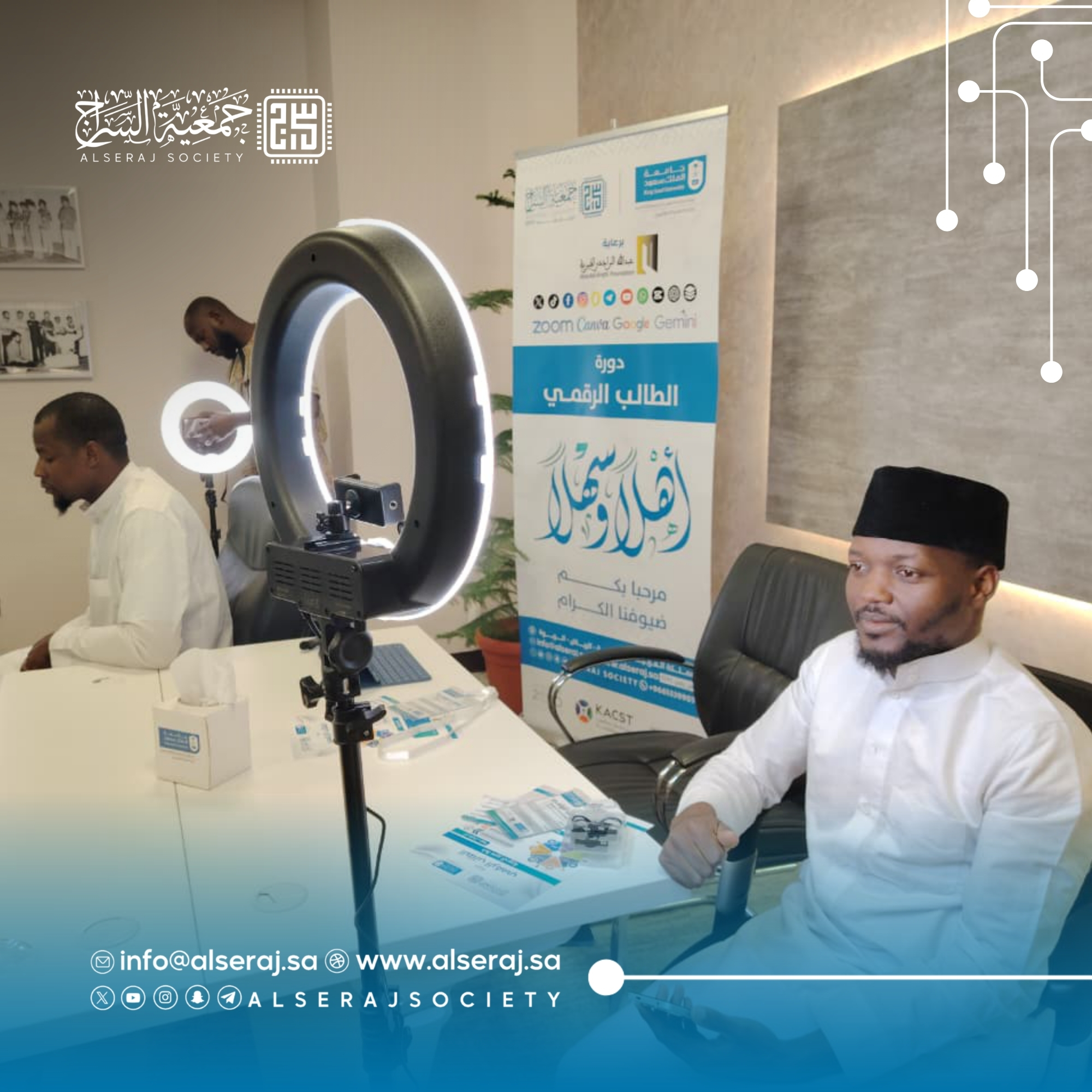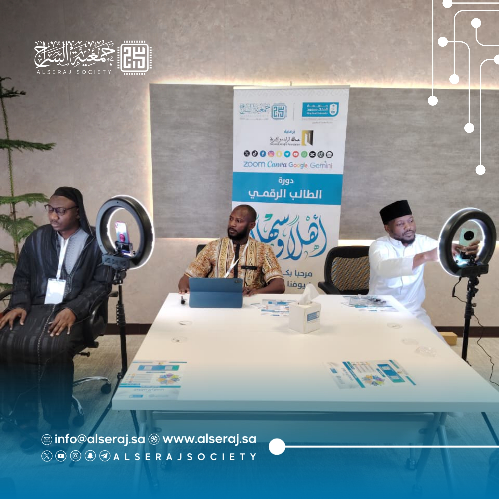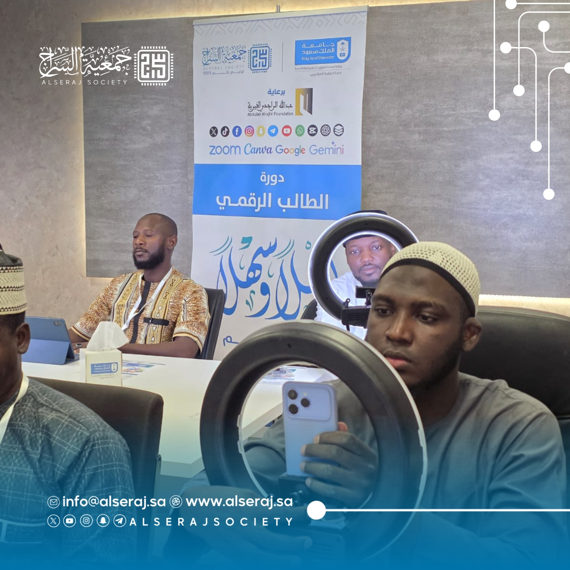 أقامت جمعية السراج اليوم 30 سبتمبر 2025م دورة الطالب الرقمي في يومها الثالث بالتعاون مع جامعة الملك سعود وكالة الشؤون التعليمية والأكاديمية – إدارة الطلبة الدوليين وبرعاية مؤسسة عبدالله الراجحي الخيرية, حيث تناول البرنامج الجانب العملي والإنتاجي للمحتوى، مع تركيز على التصوير والمونتاج.