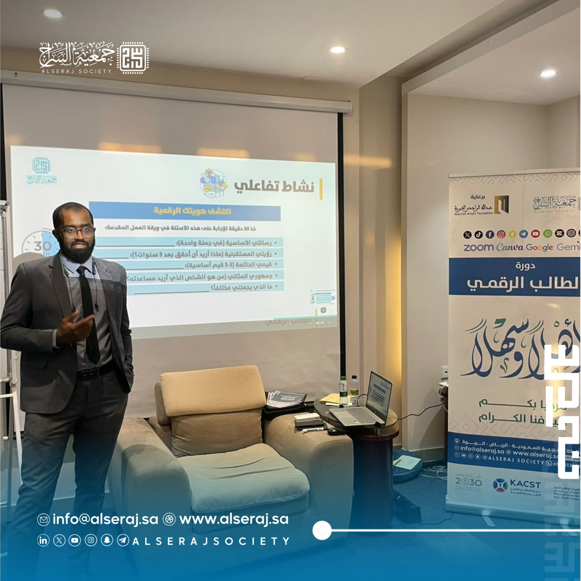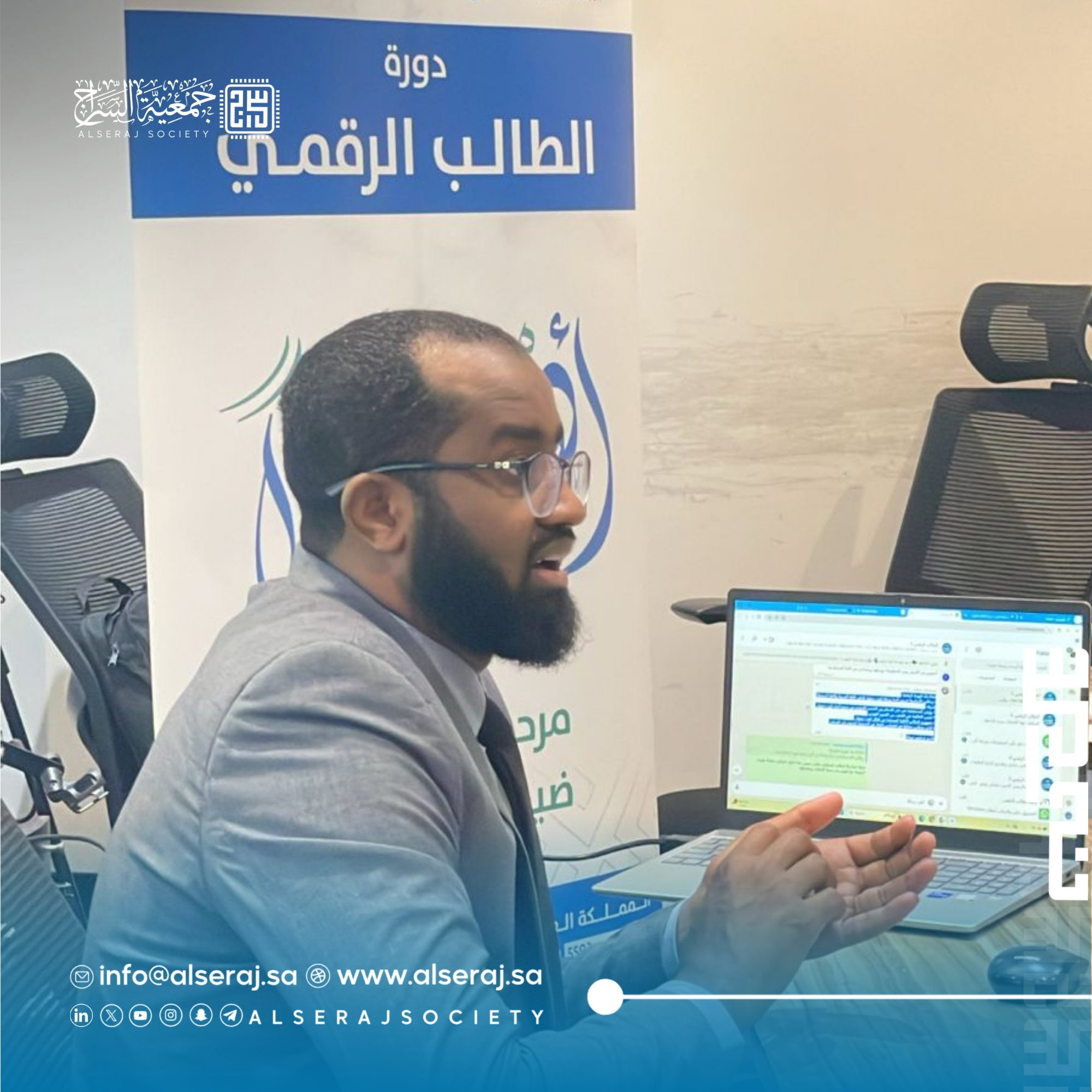 أقامت جمعية السراج اليوم 12 نوفمبر 2025م الموافق 21 جمادى الأولى 1447هـ دورة الطالب الرقمي الرابعة  في يومها الاول وتستمر اربعة ايام برعاية مؤسسة عبدالله الراجحي الخيرية وبالتعاون مع مركز وارث ,حيث تهدف الدورة إلى تزويد الطلاب بالمهارات والأدوات التقنية الحديثة لإدارة منصاتهم الرقمية بفاعلية، مع تمكينهم من توظيف الذكاء الاصطناعي في تطوير محتوى مبتكر وقيَمي.