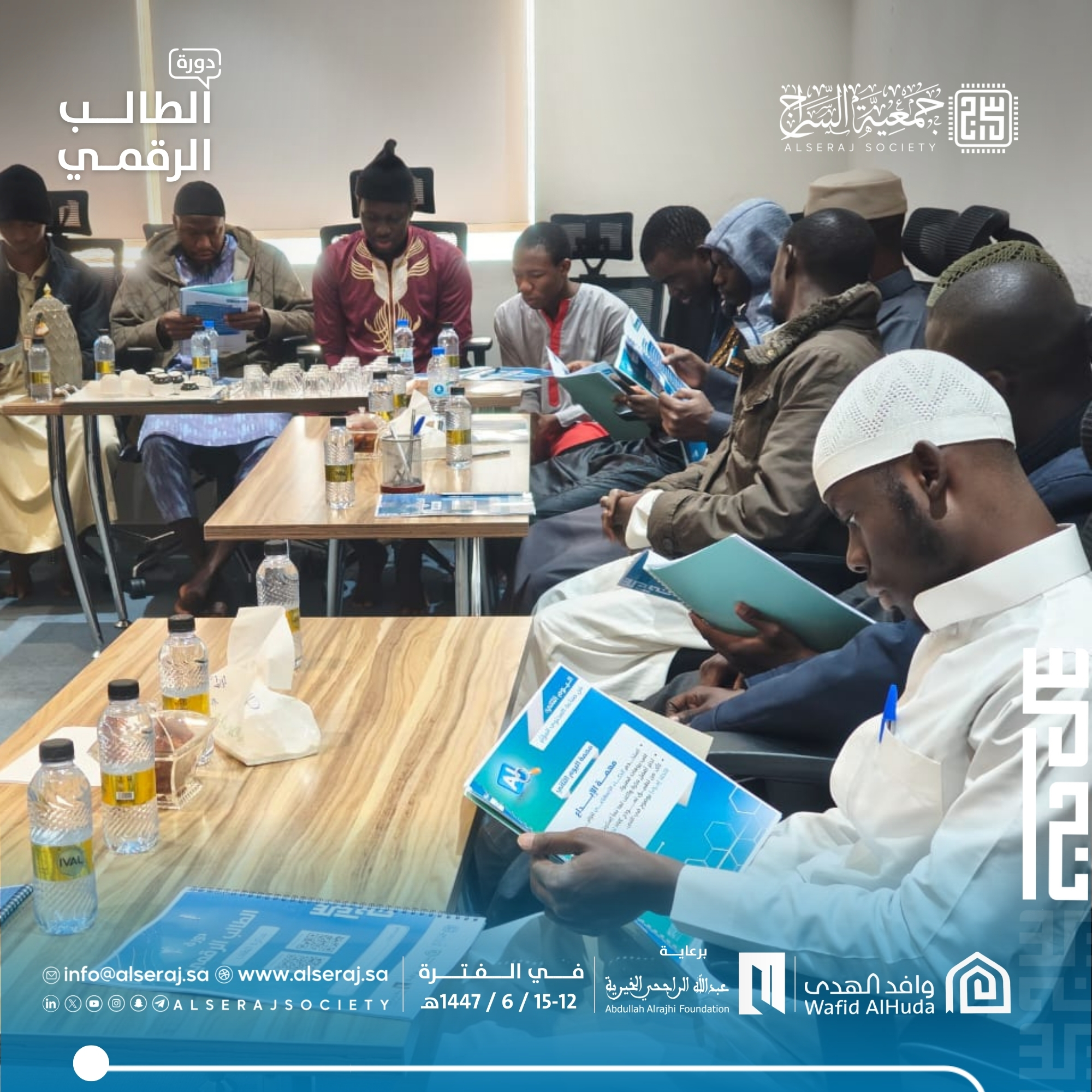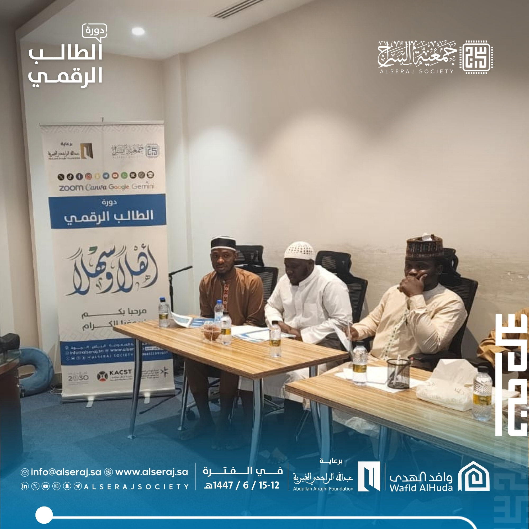 أقامت جمعية السراج اليوم الاربعاء 3 ديسمبر 2025م الموافق 12 جمادى الاخرة 1447هـ دورة الطالب الرقمي السادسة في يومها الاول وتستمر اربعة ايام برعاية مؤسسة عبدالله الراجحي الخيرية بمركز وارث بالتعاون مع وافد الهدى ,حيث تهدف الدورة إلى تزويد الطلاب بالمهارات والأدوات التقنية الحديثة لإدارة منصاتهم الرقمية بفاعلية، مع تمكينهم من توظيف الذكاء الاصطناعي في تطوير محتوى مبتكر وقيَمي.