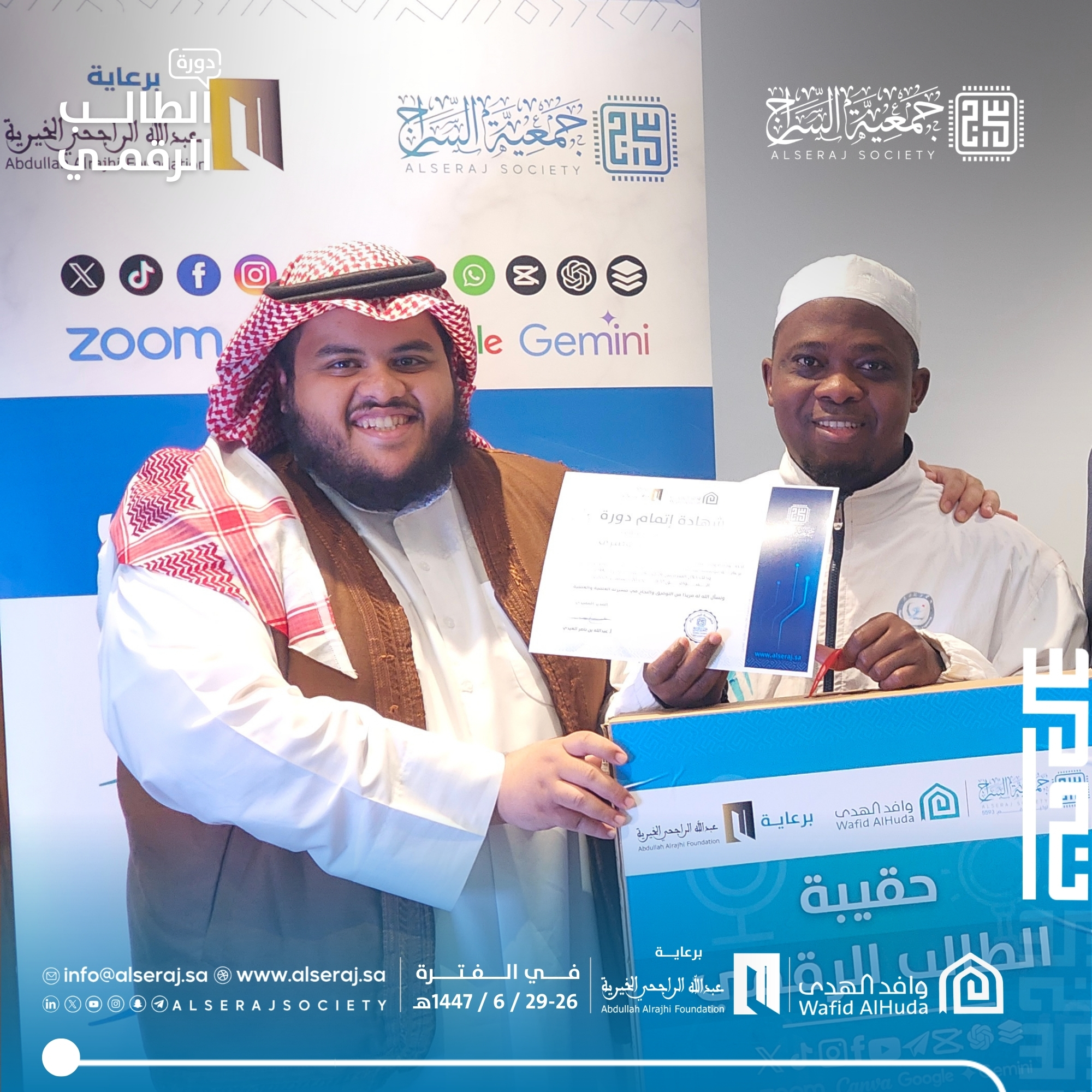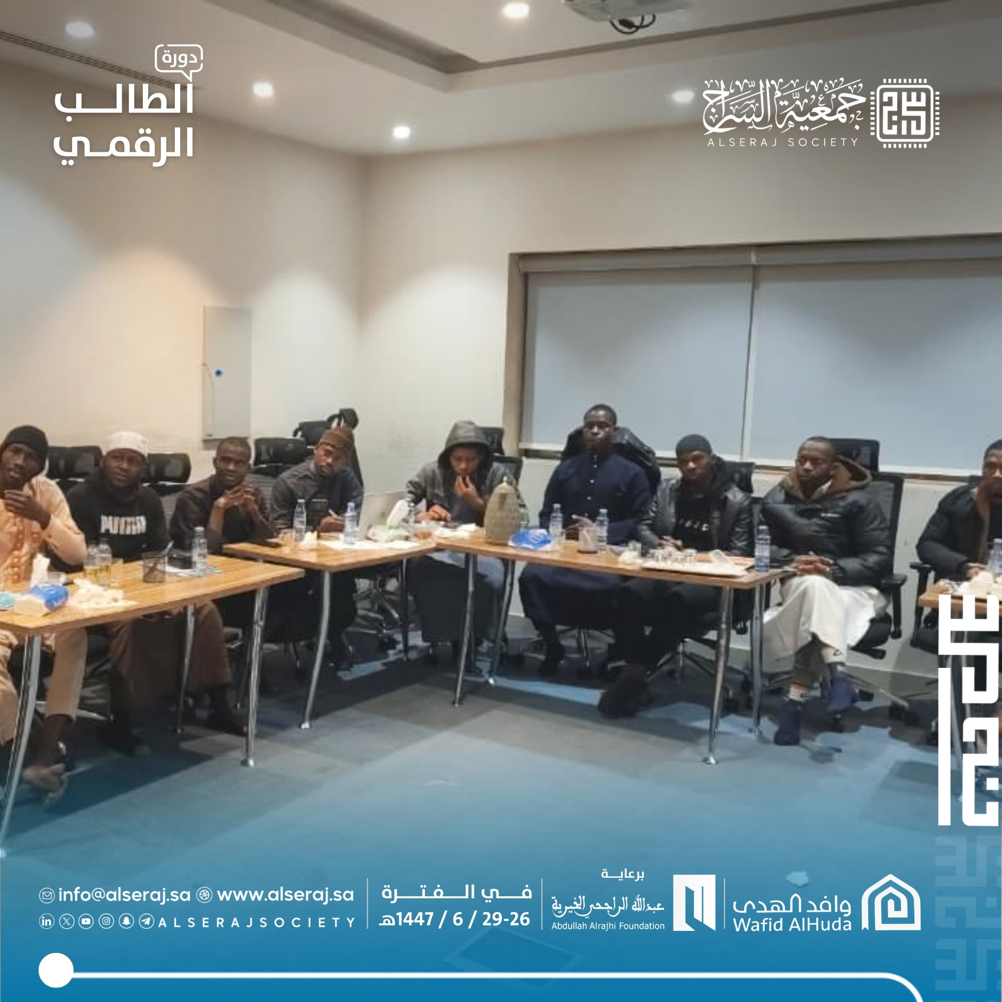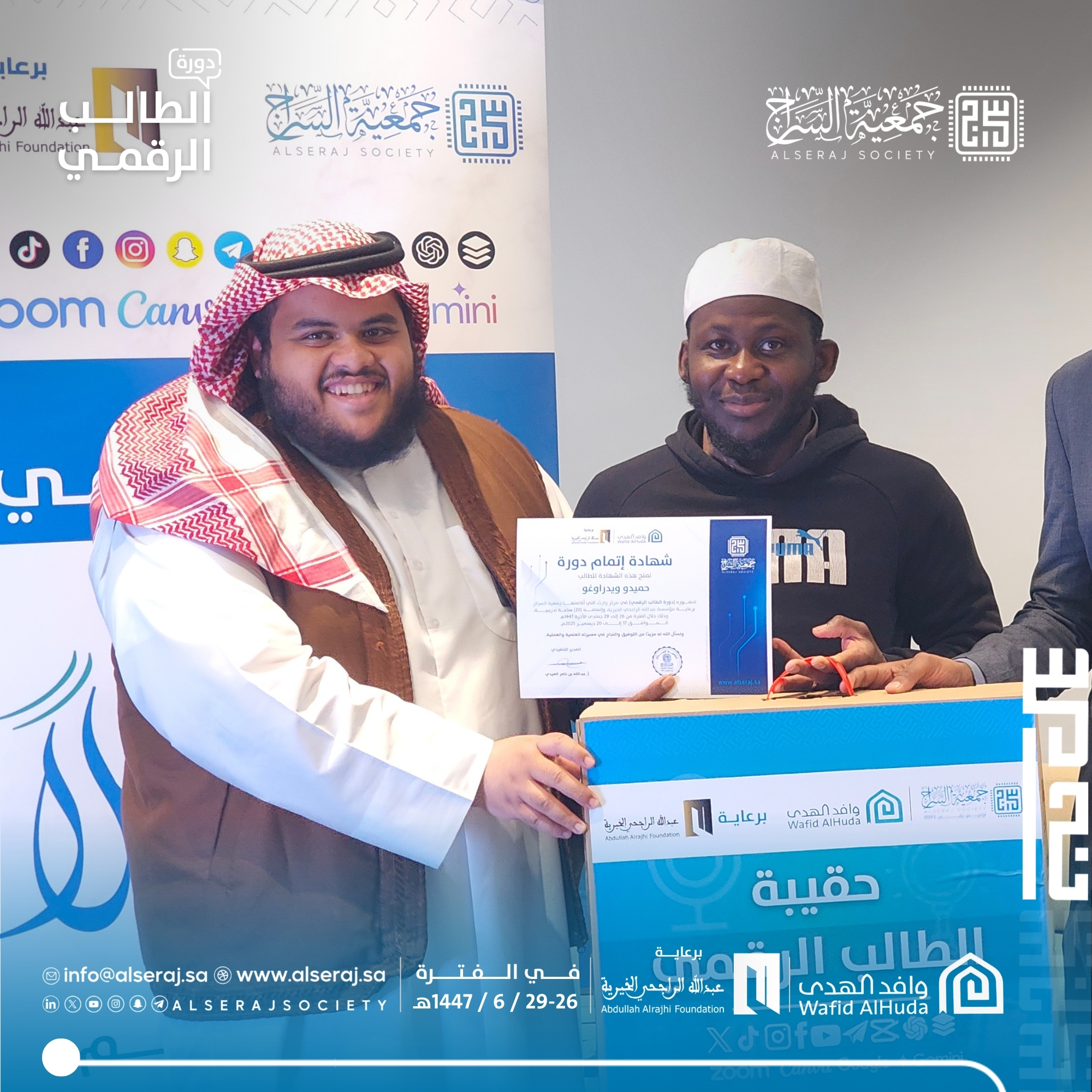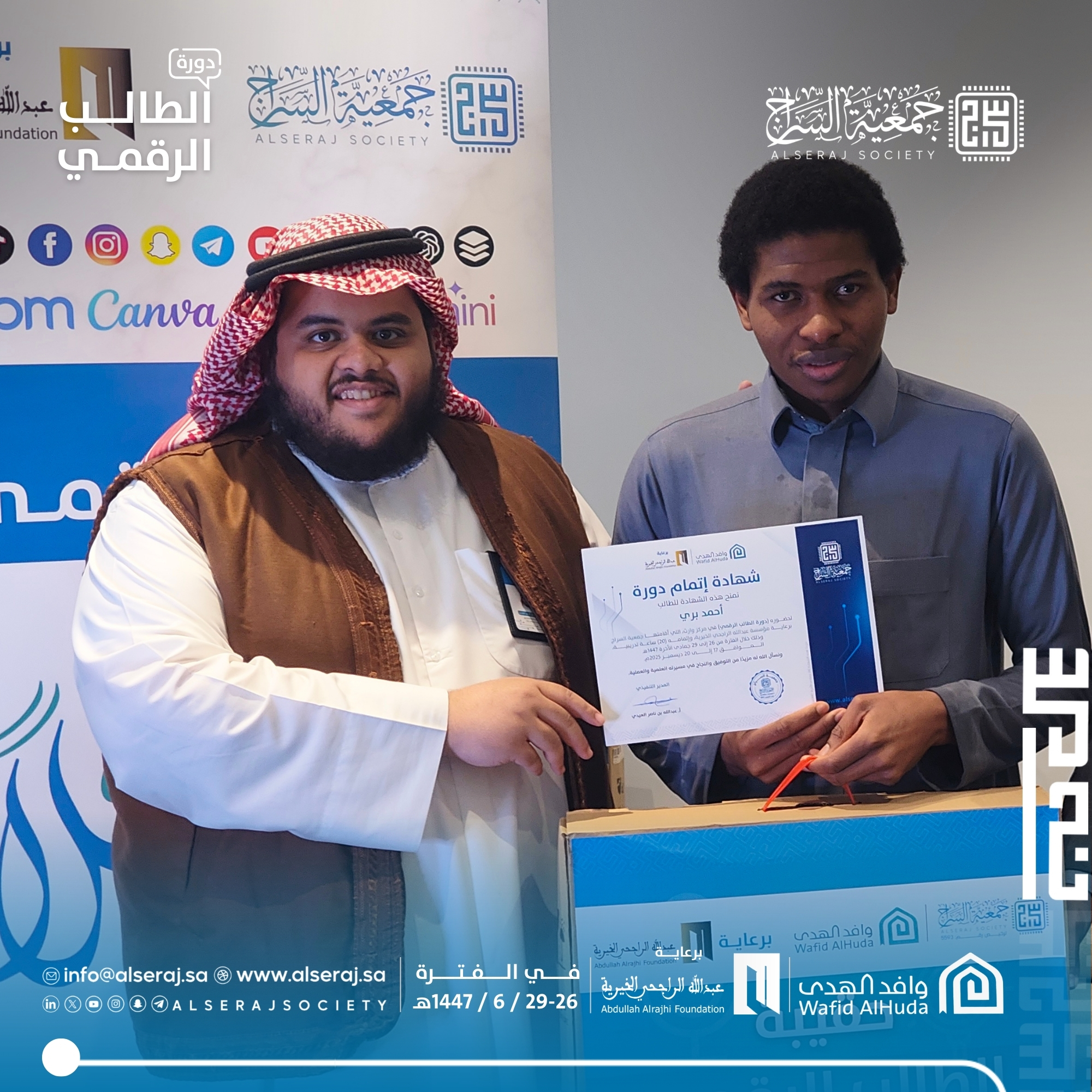 اختتمت جمعية السراج اليوم السبت 20 ديسمبر 2025م الموافق 29 جمادى الاخرة 1447هـ دورة الطالب الرقمي الثامنة في سلسلة دورات الطالب الرقمي التي تقيمها الجمعية برعاية كريمة من مؤسسة عبدالله الراجحي الخيرية بمركز وارث وبالتعاون مع وافد الهدى.