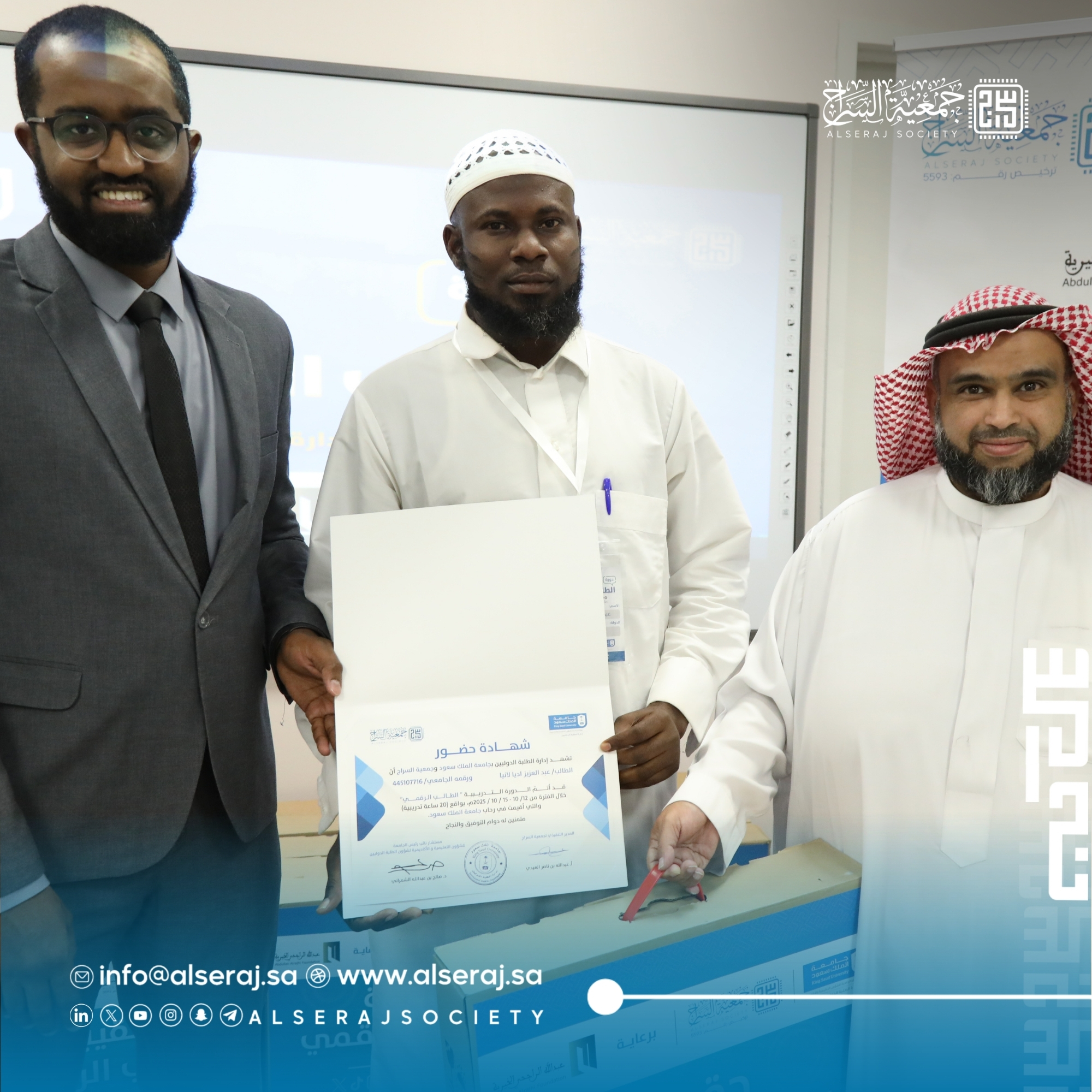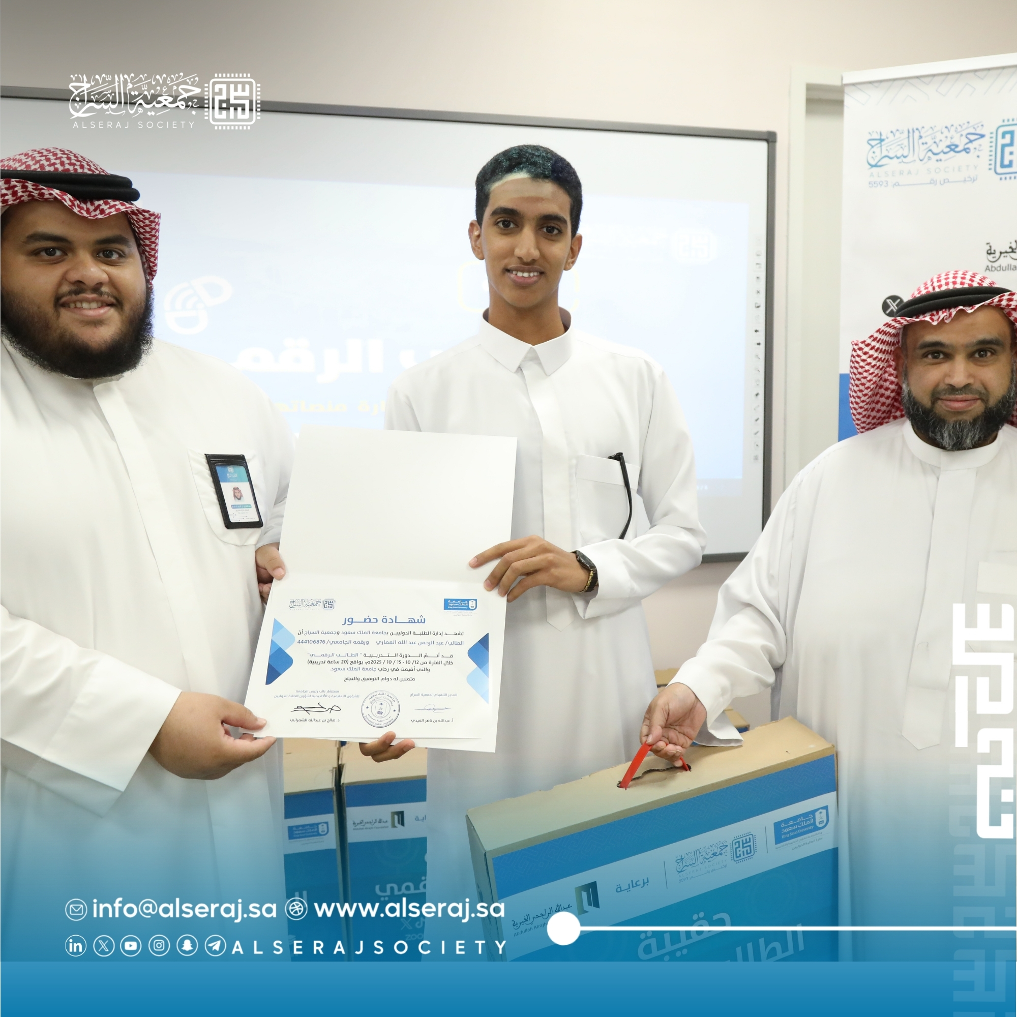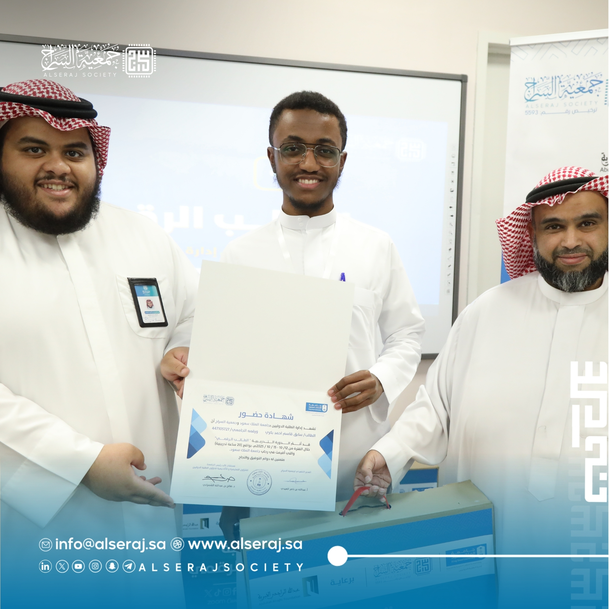 اختتمت جمعية السراج اليوم الأربعاء 15 أكتوبر 2025م الموافق 23 ربيع الآخر 1447هـ دورة الطالب الرقمي الثانية في سلسلة دورات الطالب الرقمي التي تقيمها الجمعية بالتعاون مع جامعة الملك سعود وكالة الشؤون التعليمية والأكاديمية – إدارة الطلبة الدوليين وبرعاية كريمة من مؤسسة عبدالله الراجحي الخيرية.