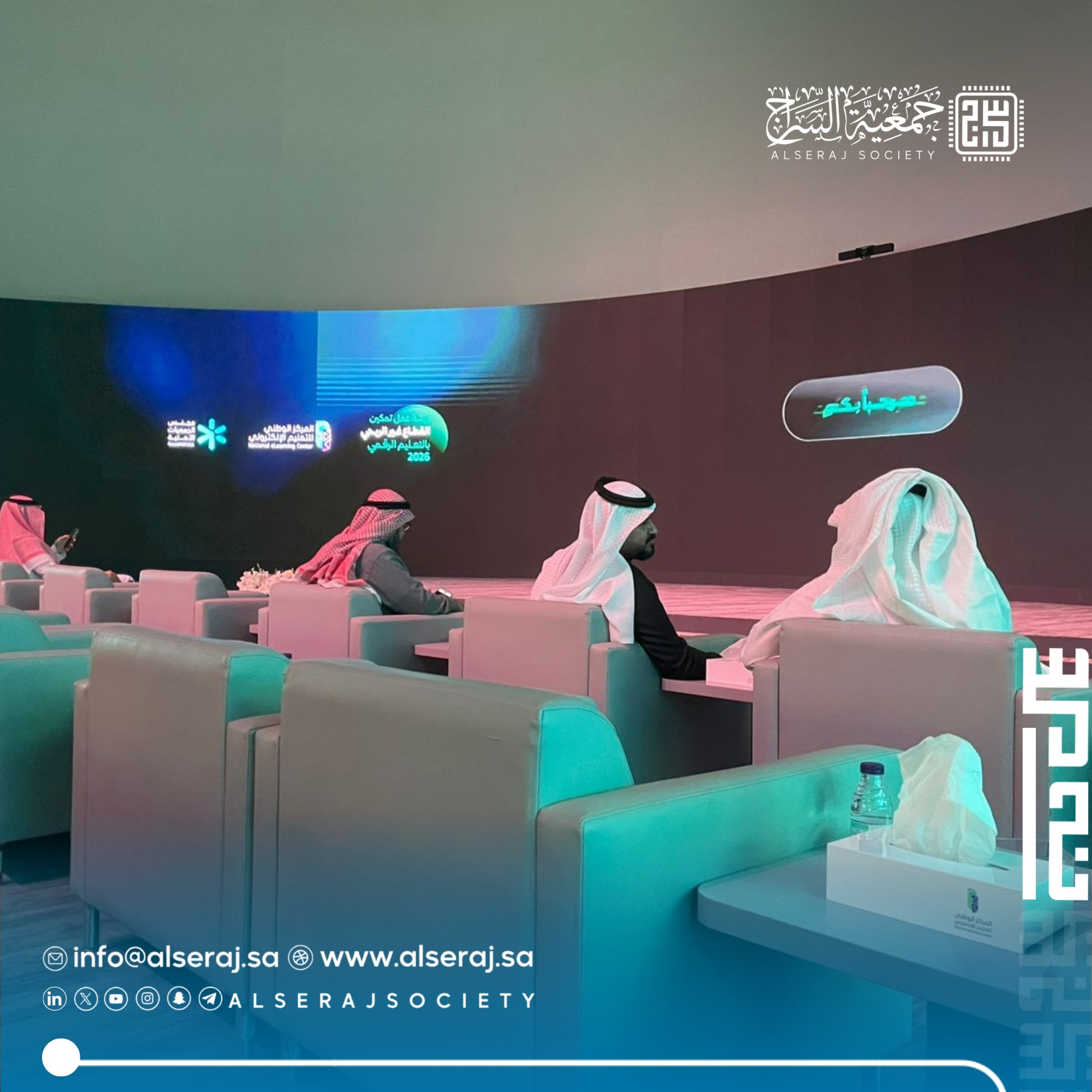 شاركت جمعية السراج يوم الاربعاء 11 فبراير 2026م في ورشة عمل “تمكين القطاع غير الربحي بالتعليم الرقمي”، والتي جمعت نخبة من الخبراء والمختصين من المركز الوطني للتعليم الإلكتروني ومجلس الجمعيات الأهلية.